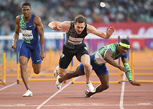 Le champion jamaïcain Omar McLeod a chuté avant d’atteindre le bout de quelques mètres, arrivant à la cinquième place (13:48).